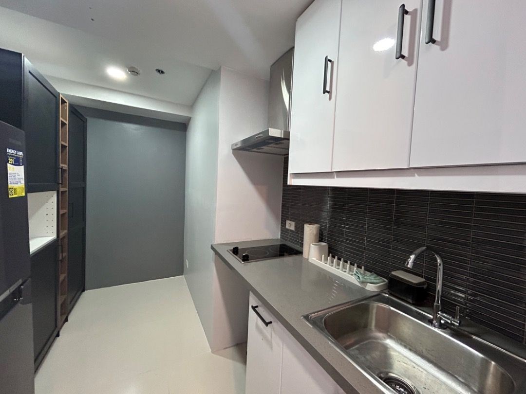 2 Bedroom overlooking EDSA, Solaire and Seda Vertis. Floor Area: 49 sqm. Fully Furnished with refrigerator, microwave, induction stovetop and washer/dryer.
