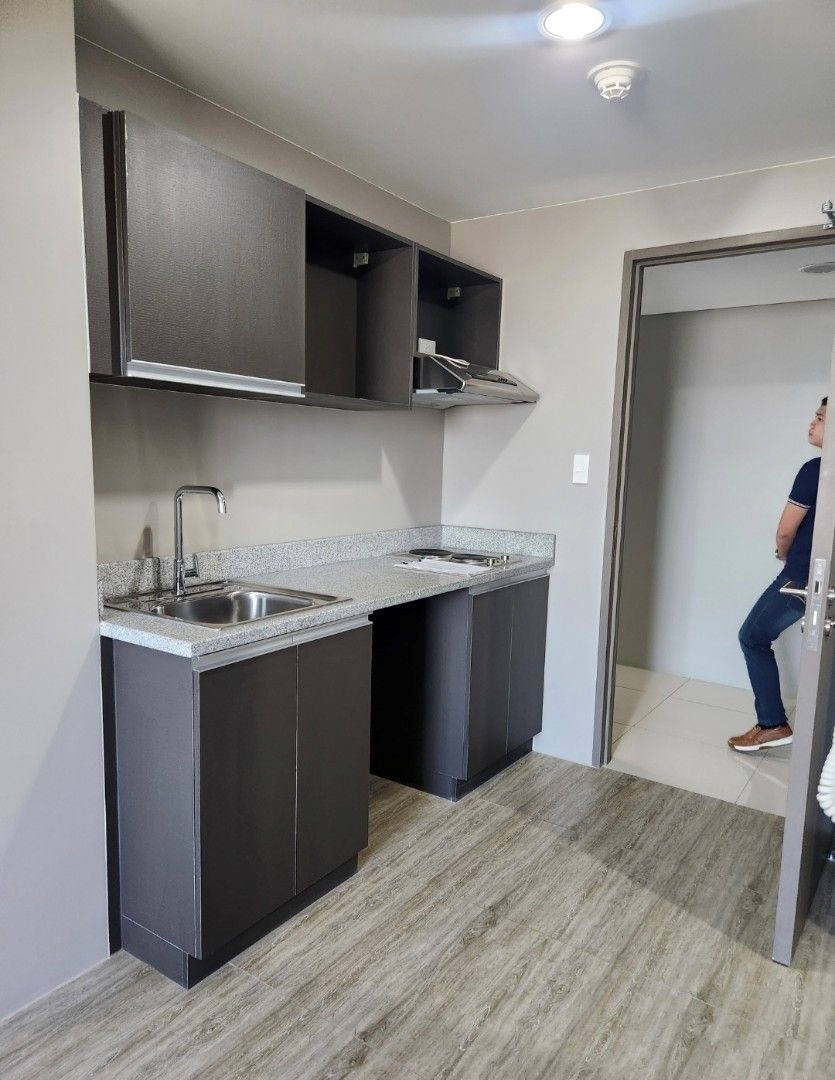 Studio Unit facing ADMU & Mirriam College. Floor Area: 25 sqm. Semi Furnished with 2-electric stove, rangehood, built-in kitchen cabinet, refrigerator,sink and counter top, bathroom shower, toilet sink, aircon, intercom, doorbell, provision for cable, telephone