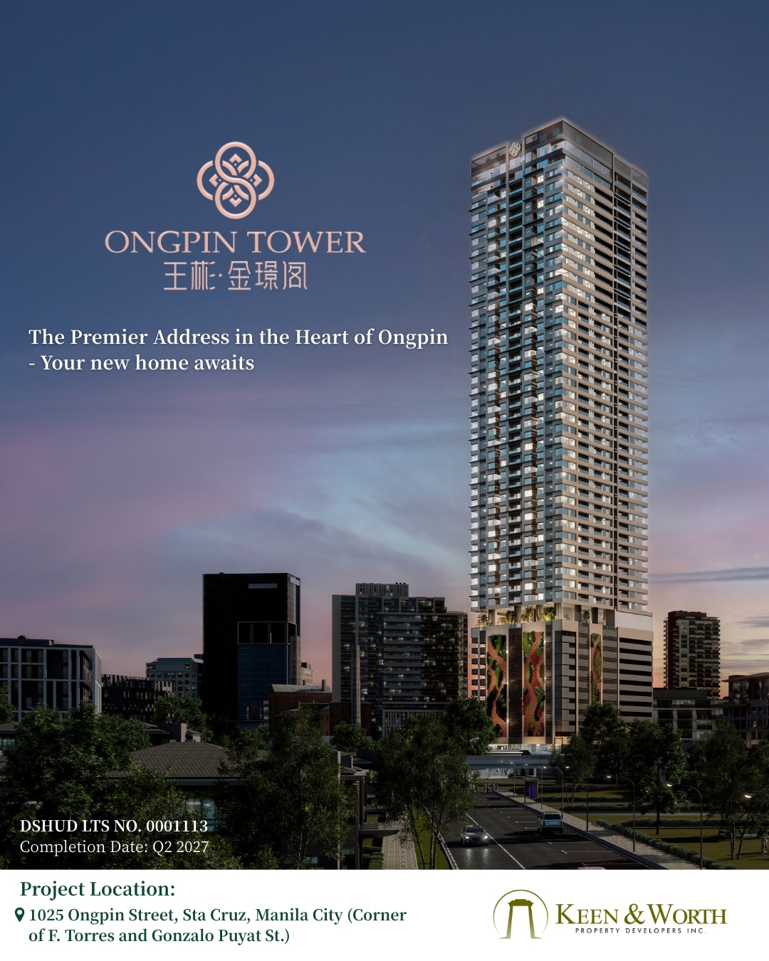 A prestigious residence designed for Filipino-Chinese families in the world's oldest Chinatown, Binondo. Blending modern amenities, spacious family-oriented units, and a deep commitment to sustainability, Ongpin Tower is where heritage meets contemporary comfort. Experience a home built for generations, set in a vibrant community that values culture, family, and a sustainable future. Discover your new home in Binondo at Ongpin Tower today.