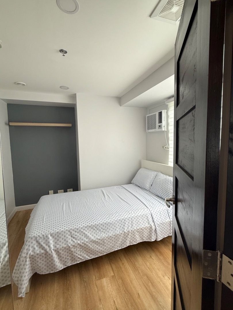 2 Bedroom overlooking EDSA, Solaire and Seda Vertis. Floor Area: 49 sqm. Fully Furnished with refrigerator, microwave, induction stovetop and washer/dryer.
